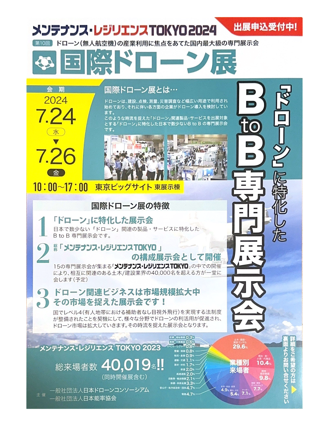 ドローンに特化したBtoB専門展示会となり、15の専門展示会が集まるメンテナンスレジリエンスTOKYOの中での開催により、相互に関連のある土木・建設業界の40,000名を超える方が一堂に会する構成展示会となっています。